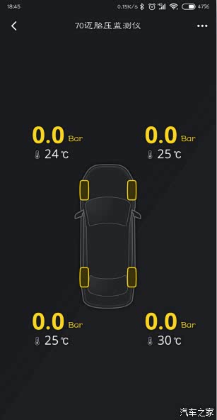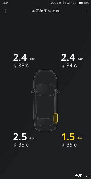 右后轮充气时的APP显示,可以看到右后轮由于胎压过低,有黄色指示。