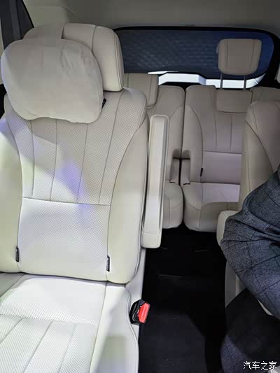 中央通道约20公分宽,移步到第三排还是比较方便的。二排座椅没有动的情况下,三排膝部刚刚贴到二排,不宽裕但够用;亮点是它的头部空间有近一拳的距离,这种空间优势得益于方方正正的D柱设计,成年人坐第三排,没有特别的憋屈感。