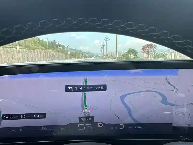 中途堵车,换另外一段高速,正好测试了一下全程120的路段,跑满限速的情况,内江服务区-三绕金堂服务区,151公里,表显311出发,到时剩余96,平均速度106,赶紧充电,120速度下的电耗还是有点高啊!