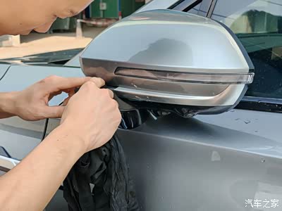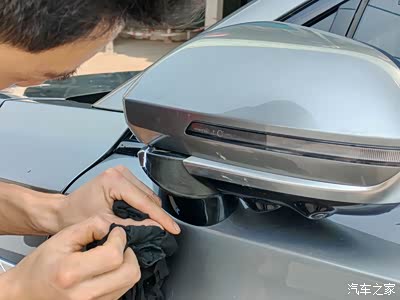 师傅先把在后视镜的地方都擦拭干净,调整好位置,事前工作要准备好,这样出来的活才没有问题