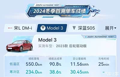 相比之下,特斯拉Model 3在寒冷区的续航成绩稍逊一筹,续航里程为234公里,达成率为38.6%。