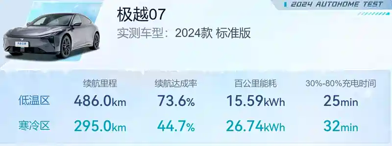 根据汽车之家的数据,极越07在寒冷区(气温-20℃~-15℃)的测试中,续航里程达到了295公里,续航达成率为44.7%。这个成绩在同类车型中确实属于佼佼者。