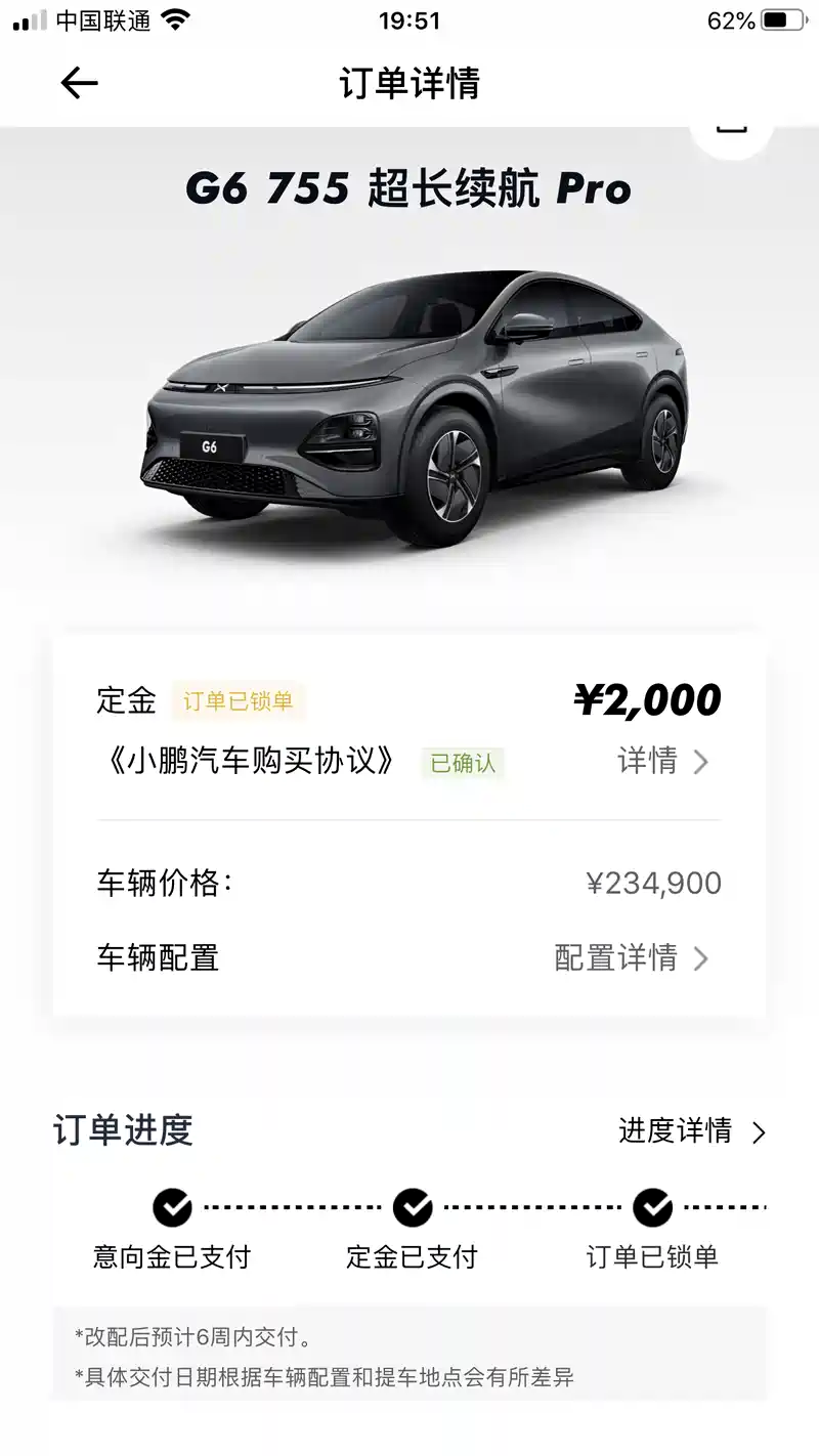 接下来就是最煎熬的等车时间,我选择的755pro版本18寸轮毂,显示6周内提车,已经是最快的一批,据说显示最长的是17周(实际上可能不用)。不过运气还不错,虽然没做到何总说的上市即交付,但也没等几天,7月5号显示配车成功,7月7号开始运输,7月10号显示车辆到店,交付专员打来电话说需要做点准备,第二天7月11号终于可以提车。