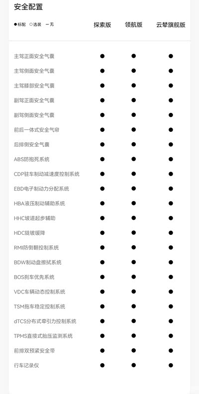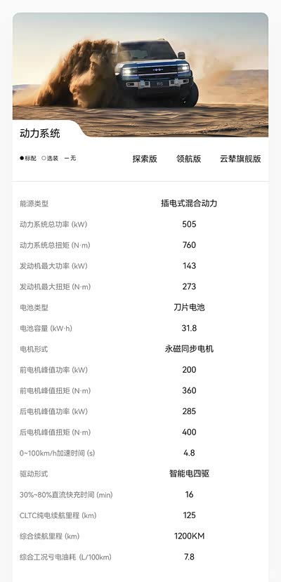 在越野配置方面,豹5采用非承载式车身,其搭载的这套四驱系统带有三把差速锁,前差速锁集成在变速箱内,后差速锁集成在后电机内,而中央差速锁为电子模拟差速锁,指的是电控系统对前后轴扭矩进行智能控制和分配。此外,该车还拥有转弯半径仅3.4米的豹式调头等16种驾驶模式可选,高配车型还会搭载云辇-P智能液压车身控制系统,通过自适应高度调节、阻尼调节、四轮联动调节,实现极限脱困、露营调平、便捷取物等功能,还具备城市驾驶多级阻尼调节功能。底盘配备了驱动总成护板和电池护板,能够避免崎岖路况下底盘磕碰损伤。