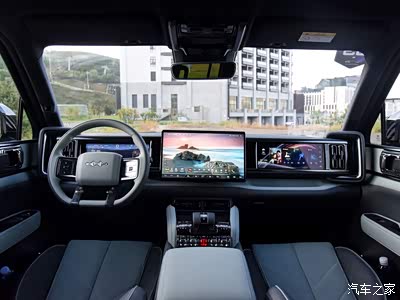 豹5内饰延续了硬派的风格,中控台部分共搭载了三块屏幕,中央是一块15.6英寸2.5K高清中控多媒体屏,主驾采用12.3英寸仪表屏,副驾位置搭载12.3英寸多媒体娱乐屏。豹5内饰设计整体基于“锁扣”这一理念,象征着链接与稳固,意味着力量和安全。中控台部分采用了可升降换挡挡杆,车辆启动时换挡升起,关闭时挡杆缓缓回落,给足了仪式感。