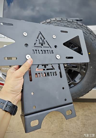 2、后备胎牌照支架:装这个需要拆掉备胎盖并替换两颗备胎螺丝,我搞了快一个小时才顺利装好,需要一定的动手能力,支架质量不错,支持外挂铁掀和射灯,锰钢材质,很重很厚实。