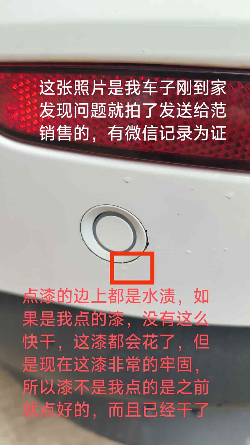 从4S出来到家到发现问题反馈给销售时间很短,左一雷达上面的补漆,要是我点的漆没那么快干,照片上可以看到漆边上有水滴,有水滴会对漆有影响,但是现在漆很牢固.很明显漆在我拍照之前已经干了。对于这个问题4S不正面回答就是说我验过车了,没有发现问题车子在4S是没有问题的,可以给我补漆或者换个保险杠。