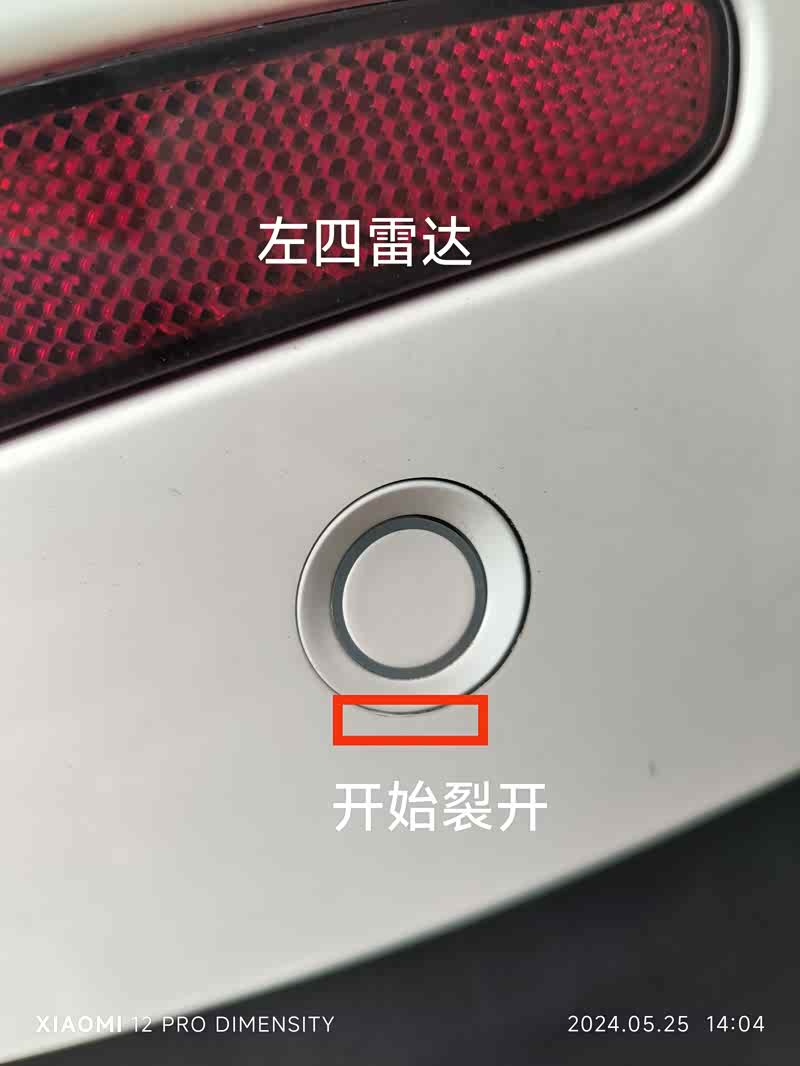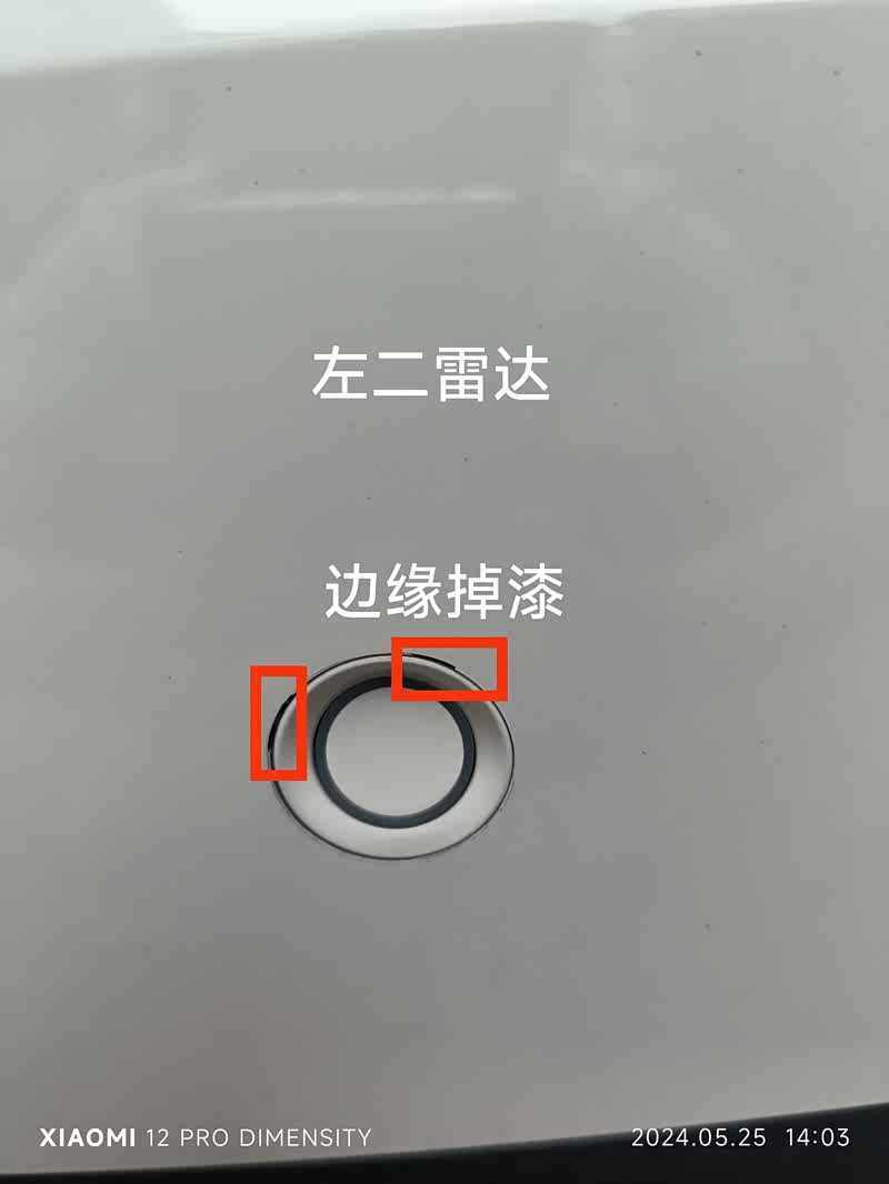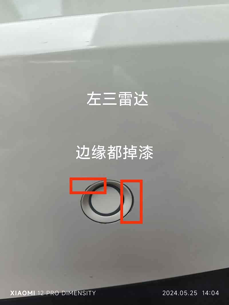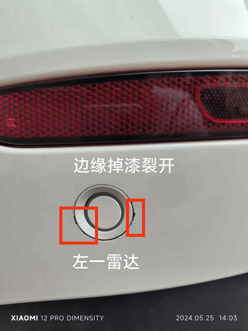 我5月12日早上9点去4S提车,9点32到的4S,10点到家,10点06分发现问题发送图片给4S销售,左后一雷达上面有漆面损伤,损伤上面有一些的点漆痕迹,因为出了4S回家才发现,4S不认。
