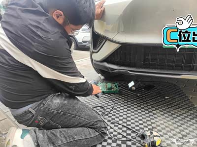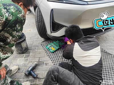 虽然是白天,车下面光线还是比较暗,小徒弟拿着手灯给老板照明,辅助老板加固保险杠。