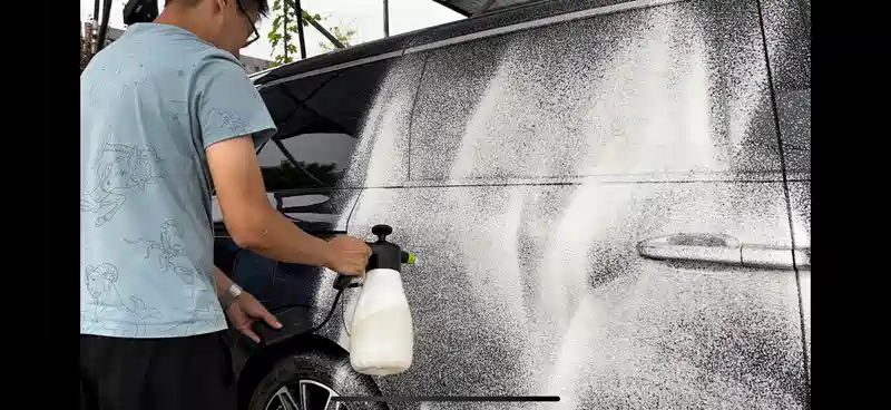 洗车的过程就像是一场仪式,每一步都充满了仪式感。我先用高压水枪从车顶开始,温柔地冲洗掉车身表面的尘土和泥沙,仿佛是在为传祺E8褪去一层旧衣。接着,我将洗车液均匀涂抹在车身,用洗车海绵轻柔地打圈擦拭,每一寸车身都不放过,享受着洗车液与车漆间细腻的化学反应。