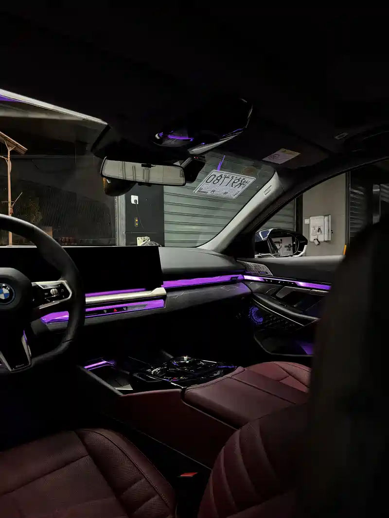 今天到店一台新款宝马i5,临牌还没验车,装贴一套隐形车衣,在加班升级一下内饰氛围套件,今天先把发光盖板安装上,星轨天幕等车衣复检时安装,后续在补齐天幕效果。