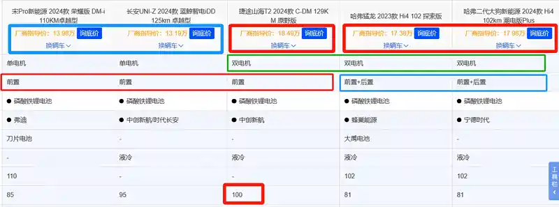 前置,前后置,价钱,电量。最大排量(ps),宋1.5L 110,长安1.5L 98,T2 1.5T 156,猛龙 1.5T 167,二代狗 1.5T 167。价钱上宋和长安是顶配,T2低配,猛龙中配,二代狗就这一个配置。我个人需求接送孩子上班通勤一天40公里,大假期的时候可能出去玩玩,不会霍霍车那种,大家帮我选选呗买那个。