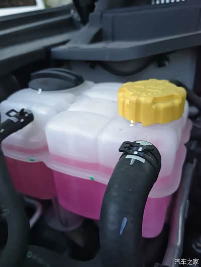 同时,我还养成了定期检查发动机舱液位的习惯:这粉色的左侧壶装的是发动机冷却液,右侧则是电池包冷却液,两者都是用的同一种防冻冷却液;