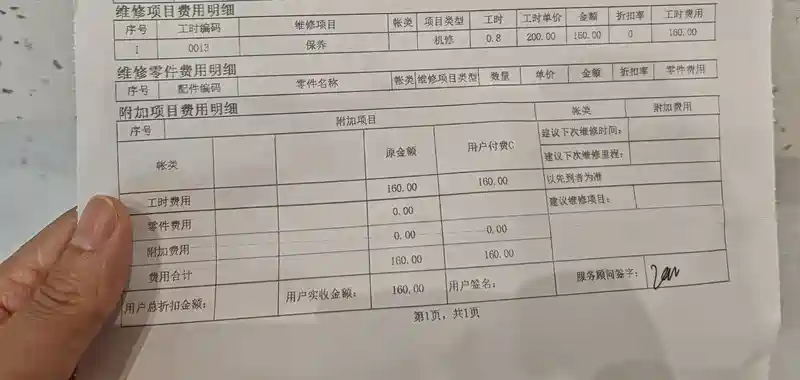 保养完去结账,本以为得花不少,结果账单就160 元工时费!顺便让师傅看了右后方的异响,怀疑是门框胶条问题,喷了润滑剂先试试。
