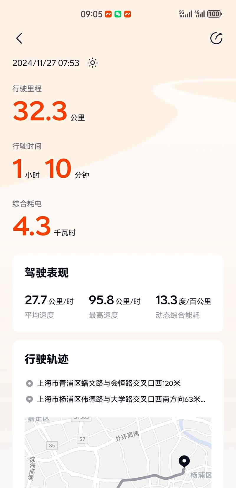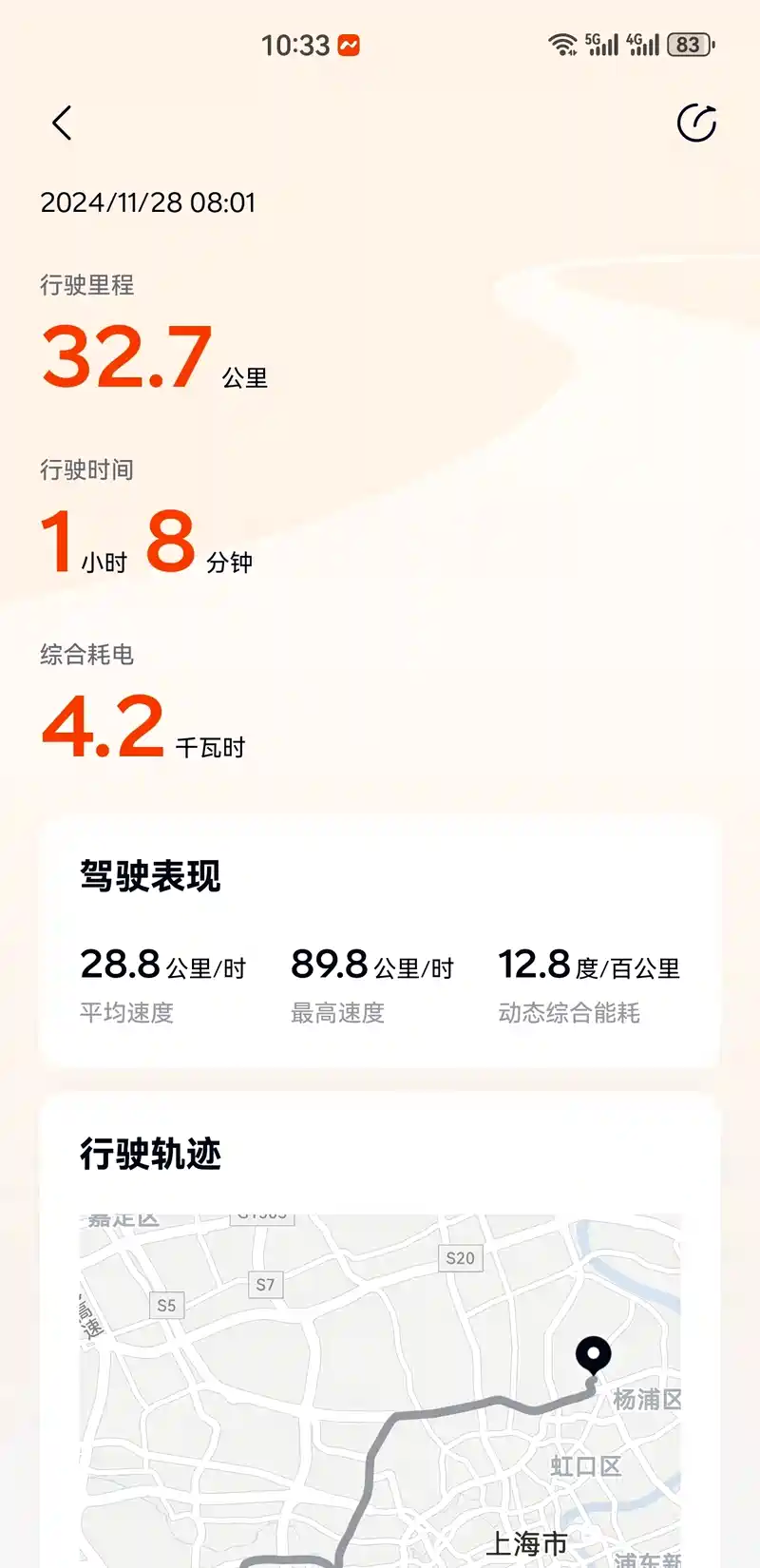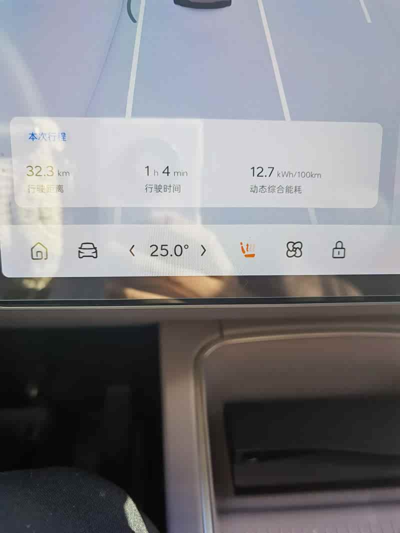 今天上班,第一次用一键备车还挺方便的,空调25度,座椅加热一档,结果往日电耗都是13点几甚至14,今天竟然降到了12.7,并且外界温度还不低!高速路段一百一左右速度,能耗表现也还不错,只是没法自动切分不同路段行程,把往返的都放到了一起统计,没有记录到纯高速电耗。接近一个月开下来,能耗还是符合预期,很多时候会在车上驻车玩车机,听歌,导致综合能耗一直在13,14左右,实际平均一下,驾驶的能耗应该在12出头。