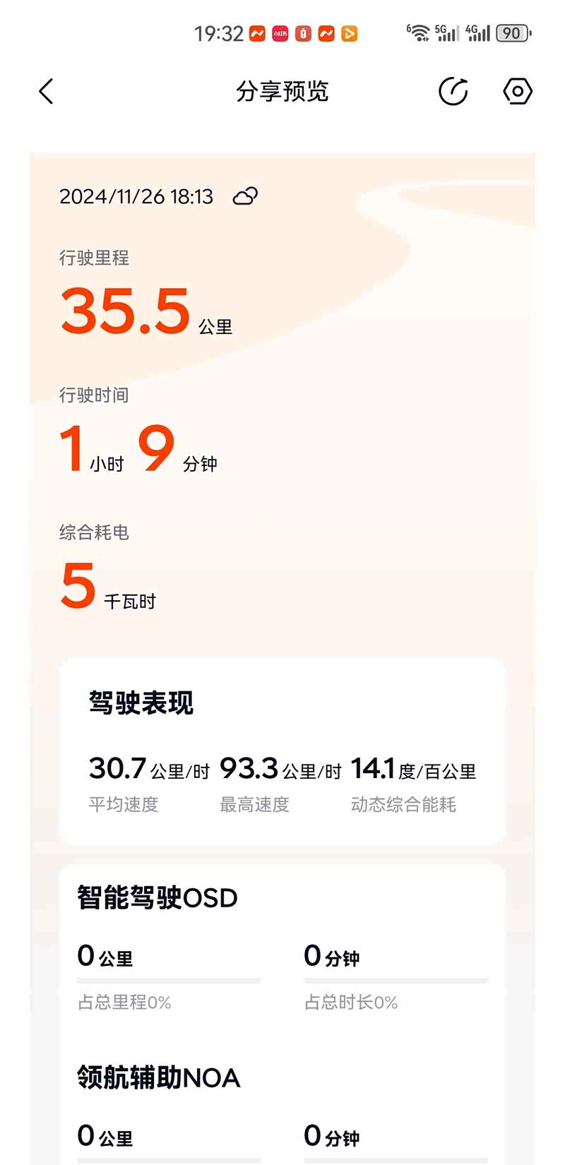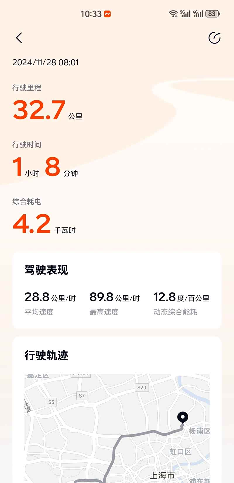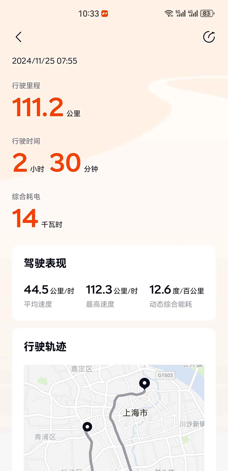 今天上班,第一次用一键备车还挺方便的,空调25度,座椅加热一档,结果往日电耗都是13点几甚至14,今天竟然降到了12.7,并且外界温度还不低!高速路段一百一左右速度,能耗表现也还不错,只是没法自动切分不同路段行程,把往返的都放到了一起统计,没有记录到纯高速电耗。接近一个月开下来,能耗还是符合预期,很多时候会在车上驻车玩车机,听歌,导致综合能耗一直在13,14左右,实际平均一下,驾驶的能耗应该在12出头。