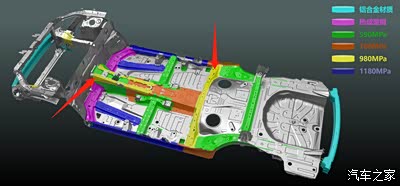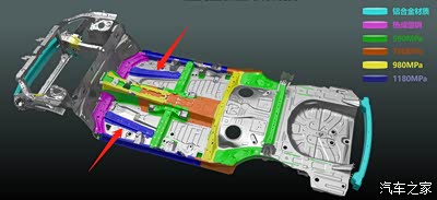 底盘下方这个部位是走排气的,本身就是拱形,更为坚固,所以没有用到特别高的强度,但是,在同级车里边在这个位置用这个强度,也是独一份了,以往的车也不过200MPa到400MPa之间。