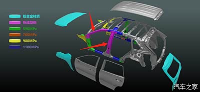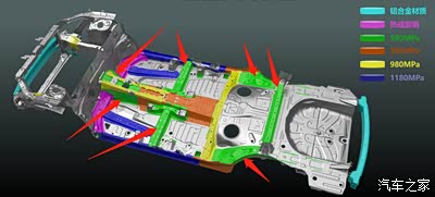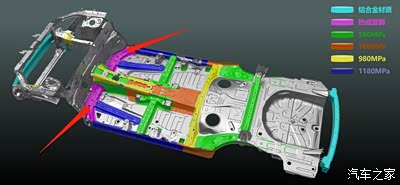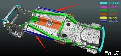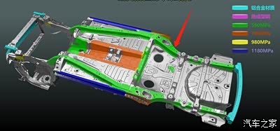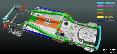 1180MPa的超高强钢用在底盘两侧的侧梁上,目的就是为了加强座舱安全性,在发生碰撞的时候,让座舱无论是纵向还是横向,都不容易变形。
