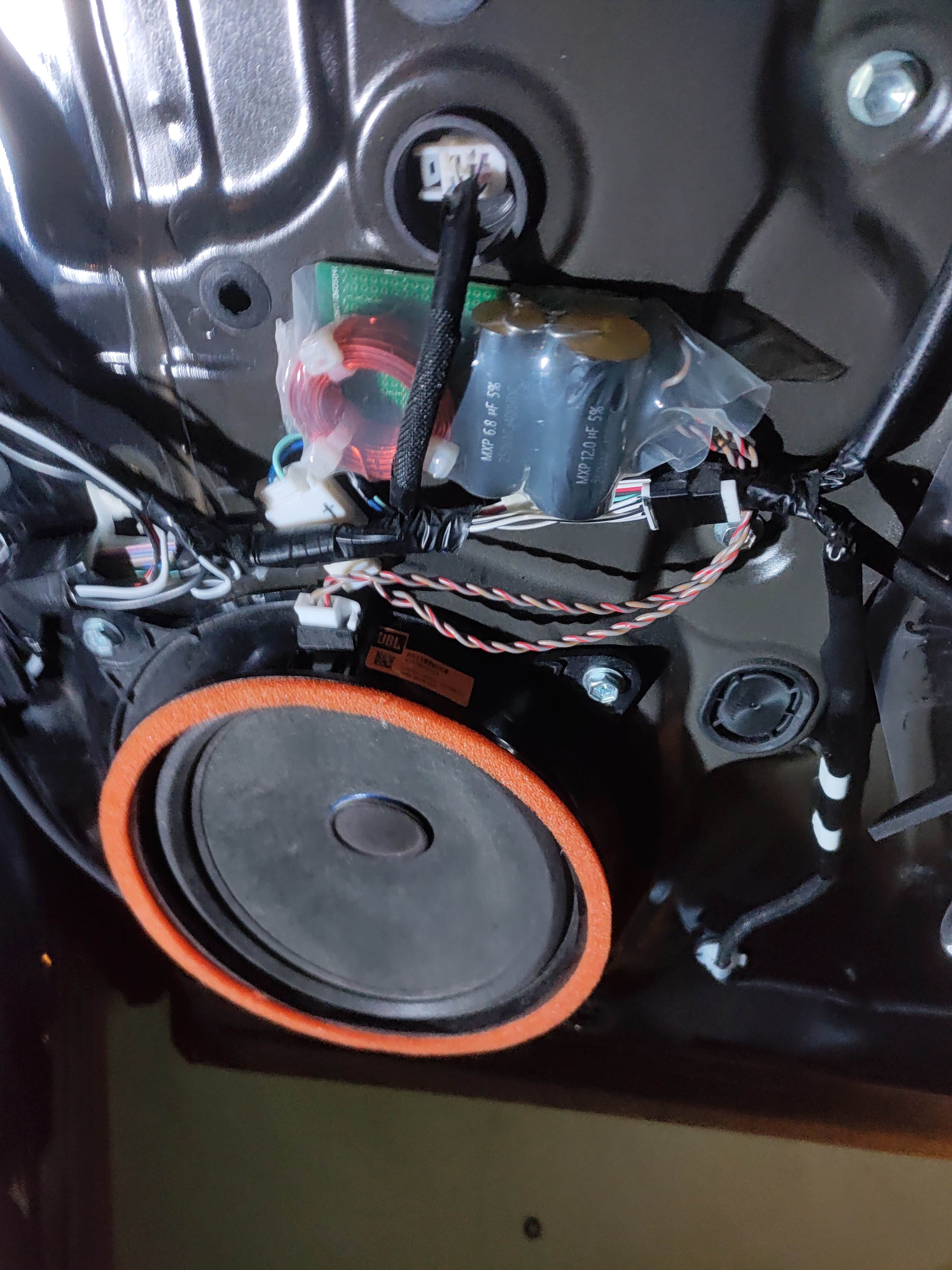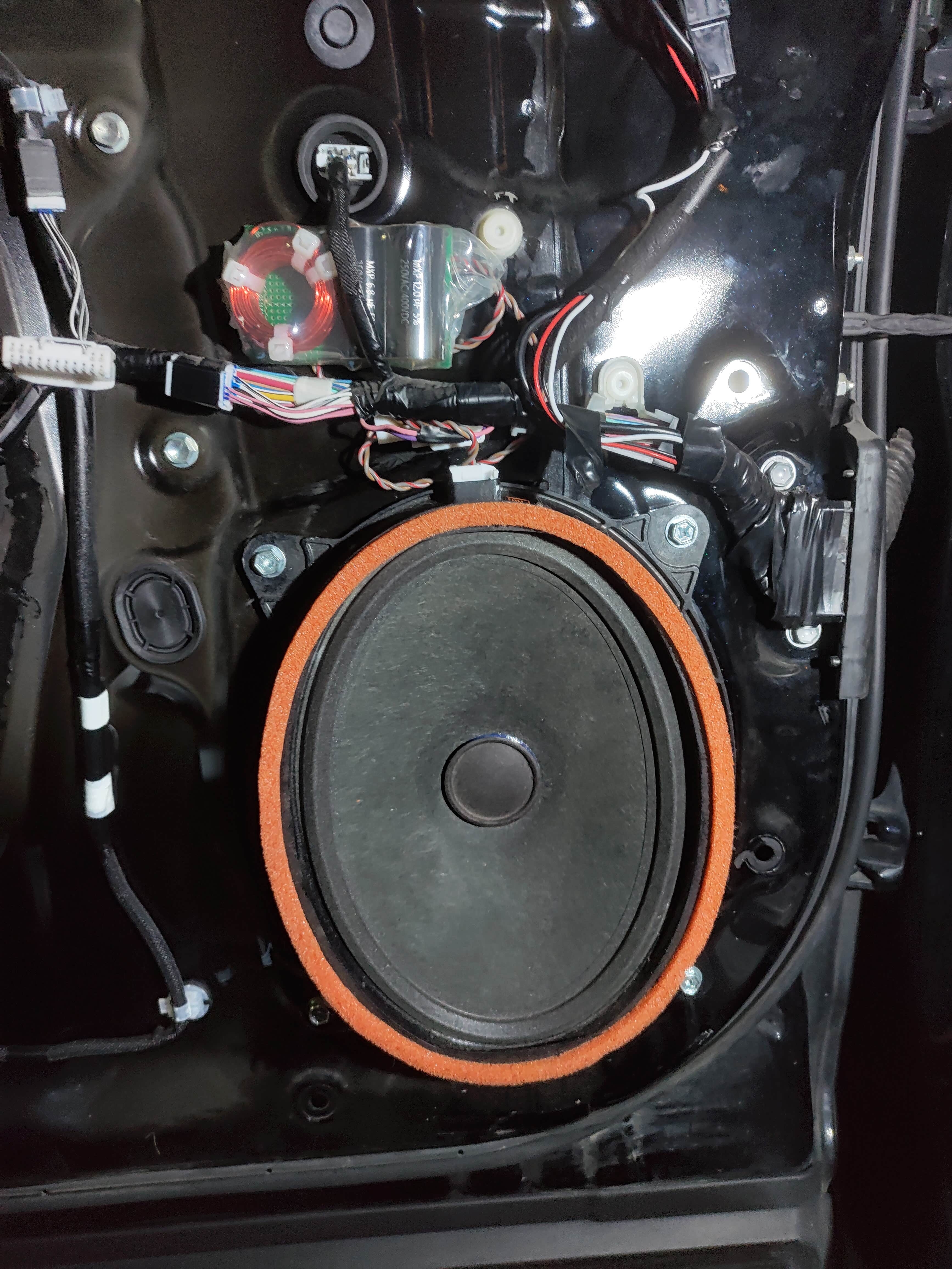 懒得做隔音,如果加少量止震板和隔音棉,吸音棉,对低音帮助绝对大,但我平时听音乐基本不开大音量,不至于门板轰轰响。至于车机其他的电容功率管,没敢动,焊个运放用了洪荒之力,真不敢动其他的了。
