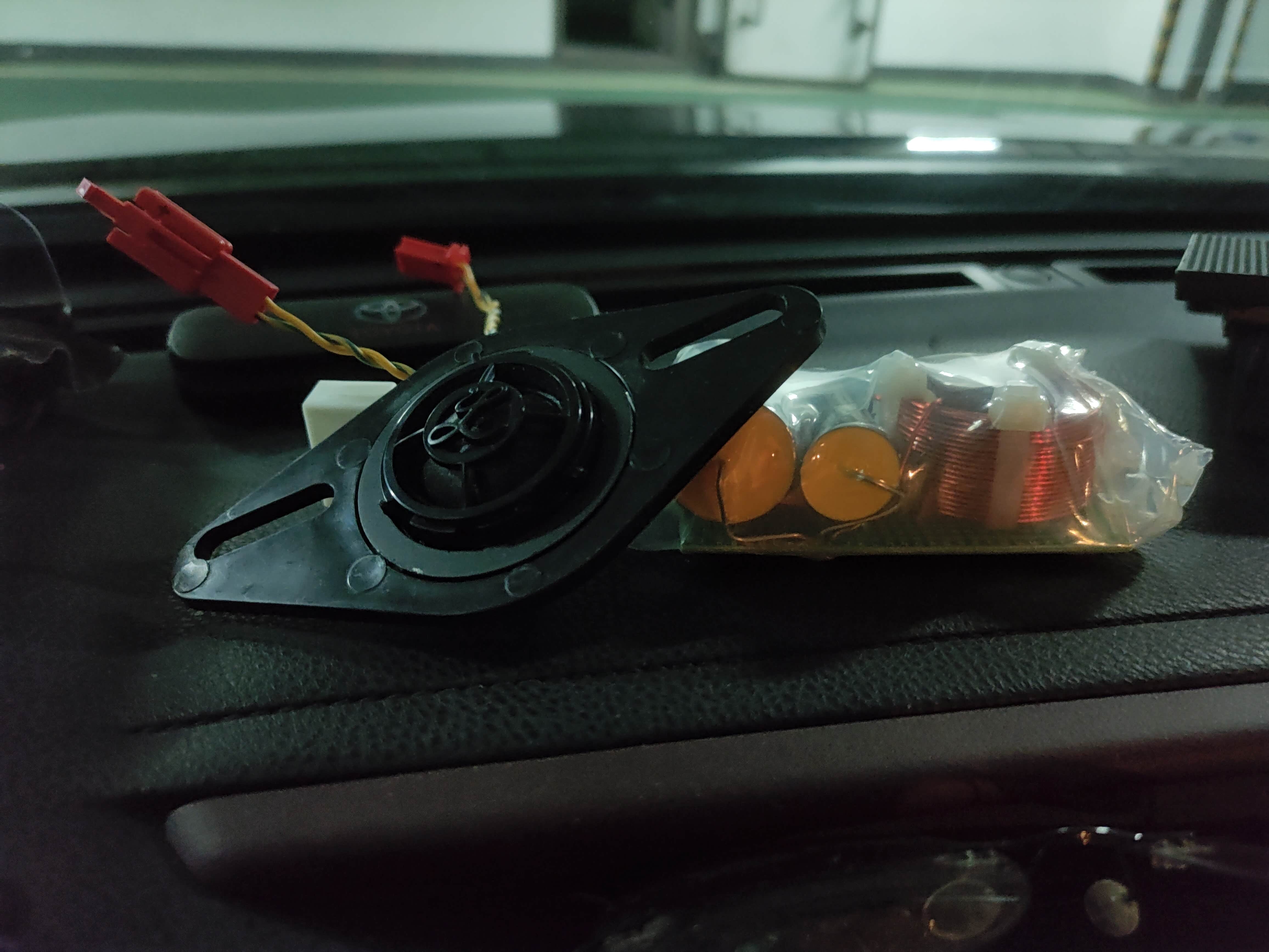 1.5寸丝膜高音卖家说是4欧,中低音找不到资料,但丰田车用喇叭一般都是4欧,打算制作4个分频器,缩小体积,直接安装在高音、中低音处用双面胶黏住。
