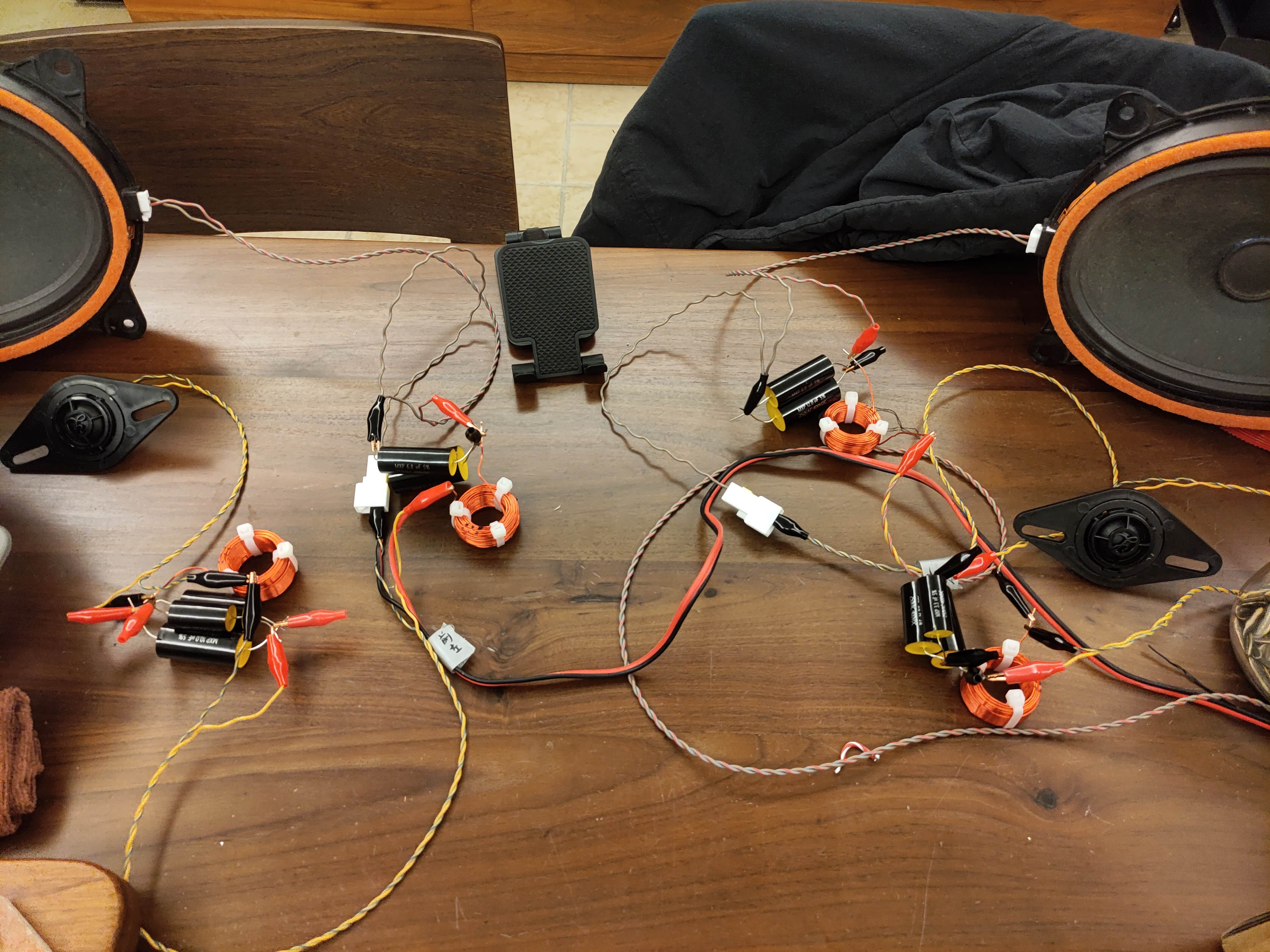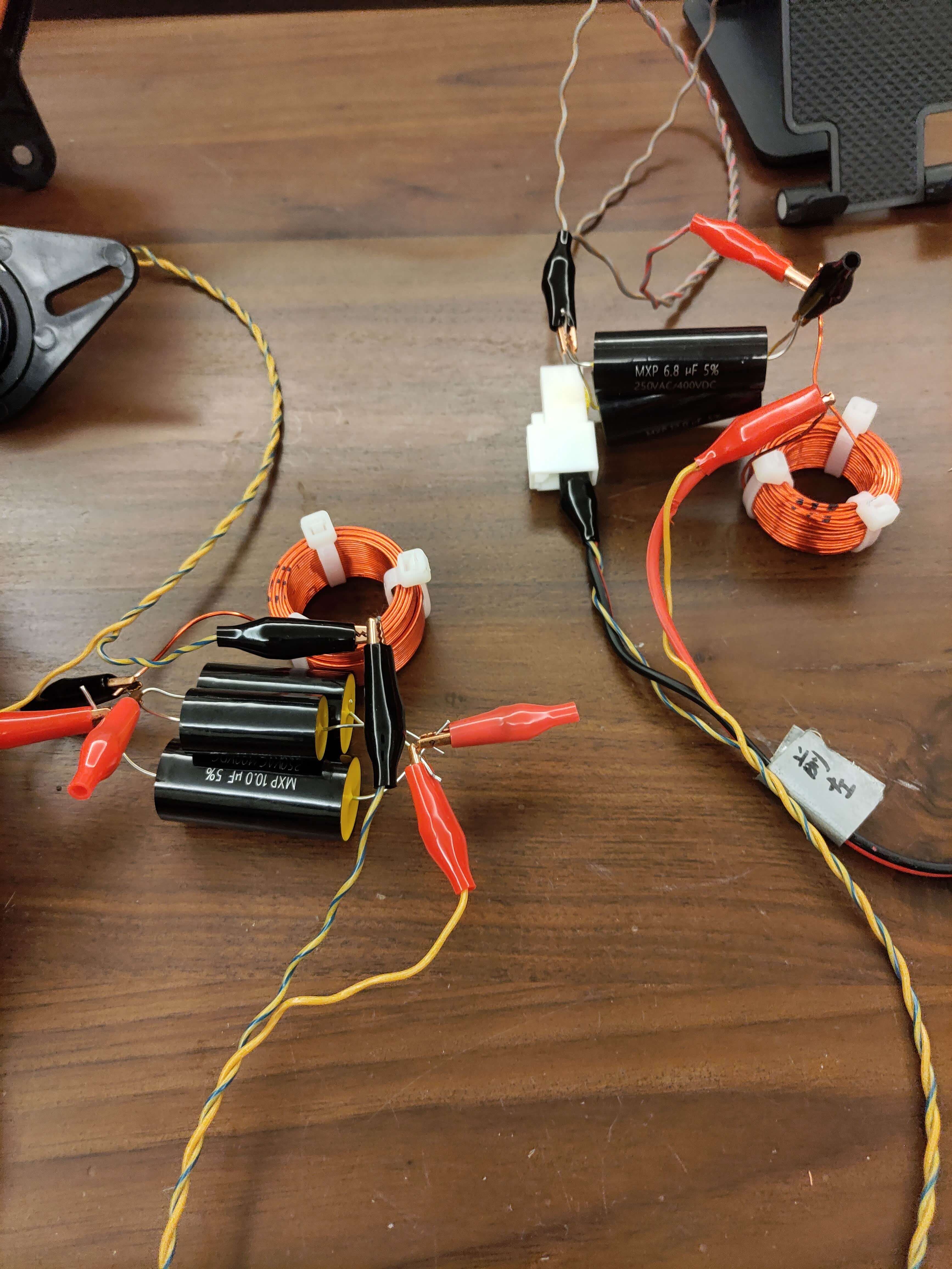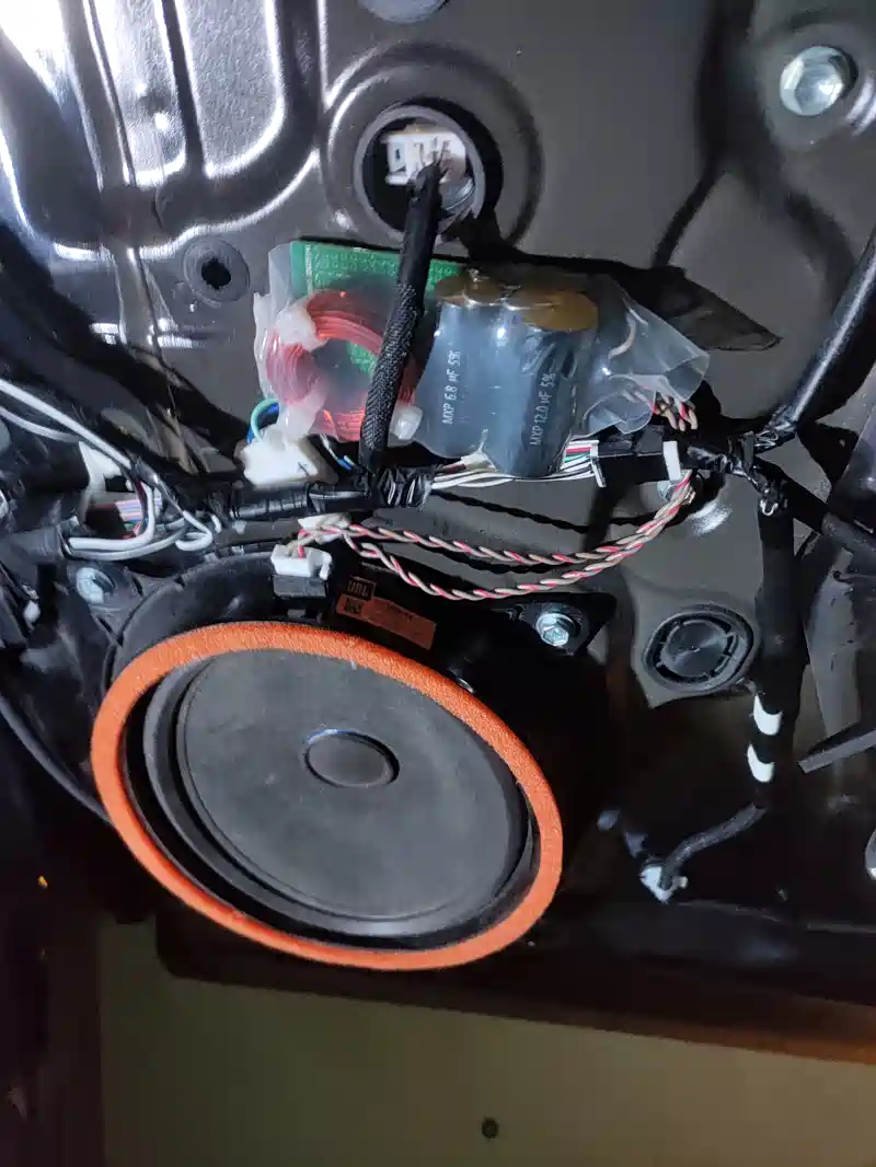 买了电容,空芯电感,买了富士通车机的排插线,先用鳄鱼夹接线测试,对应豆包给出的不同数据改变电容试听,最终还是用了上面图片中豆包给出的元件数据,高音串联18.8uf无极聚丙烯电容(12+6.8两个电容并联)并联0.304mh电感,中低音串联0.304mh电感并联18.8uf电容。