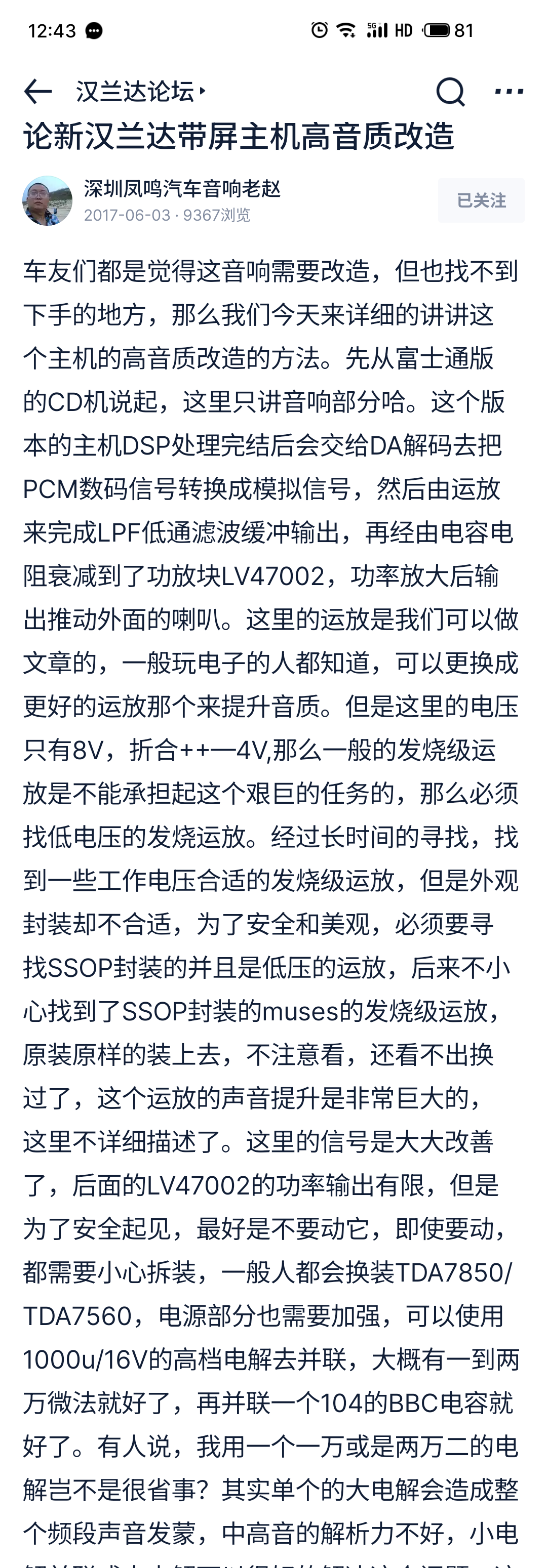 富士通主机也有提升空间,搜索了一下,2017年有篇大神深圳老赵的帖子提到了富士通4580运放改SSOP封装的muses的发烧级运放,且提到了富士通车机是双4v低压,但帖子并没有提到运放muses型号,图片上模糊的芯片型号第三排隐约可以看到41T字样,在大神贴子下询问型号,无人答复。目前的汽车之家,好像对帖子排名先后,是不以答复时间为顺序排列置顶的,跟帖了不会排到顶部来,使用体验大幅下降,因为没有回帖的必要性了。这是想流失用户的逻辑吗?