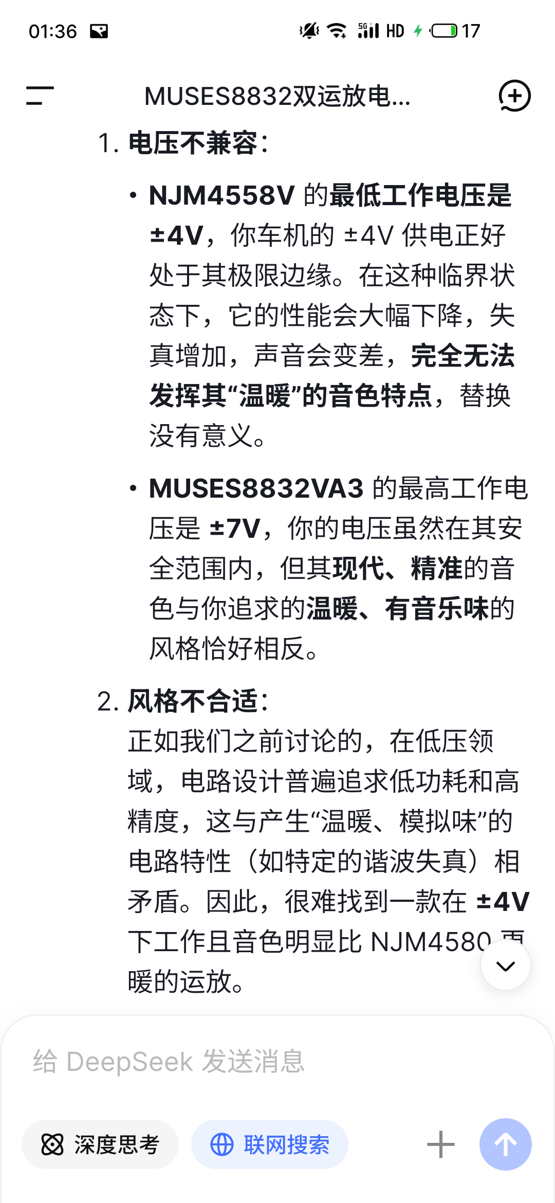 deepseek给出两款运放的音色特点,貌似更换运放对我想要的音色不利,不死心,反正有备用车机,于是直接买了,拆了4580,换了muses8832,说实话,ssop8封装的运放太小了,不好拆,不好换,买了热风枪却用不好,最终还是用了电洛铁,买了138度的低温焊锡膏,好焊一些,也方便后续更换,用牙签挑一点点用,弄了几个小时总算是焊接好了,用放大镜检查确认焊点饱满没有虚焊,没有黏连,放心装车。说实话,还有点担心这是假芯片,但好在装车试听,音色确实变好听了,高音变得细腻,中频貌似虽然比4580少了些许温暖度,但更均衡好听,低音还是宽松有量感的感受,基本没变。