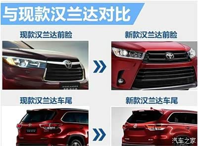 丰田新汉兰达在外观方面有所调整,新车前进气格栅与保险杠进行修改尤为醒目,使整车看起来更为硬朗。前大灯组造型流畅,内部增加了LED日间行车灯。车尾部分,新车采用了全新LED光带式尾灯使新车看起来更加时尚,同时车顶全新的小尺寸扰流板使新车看起来更加运动。