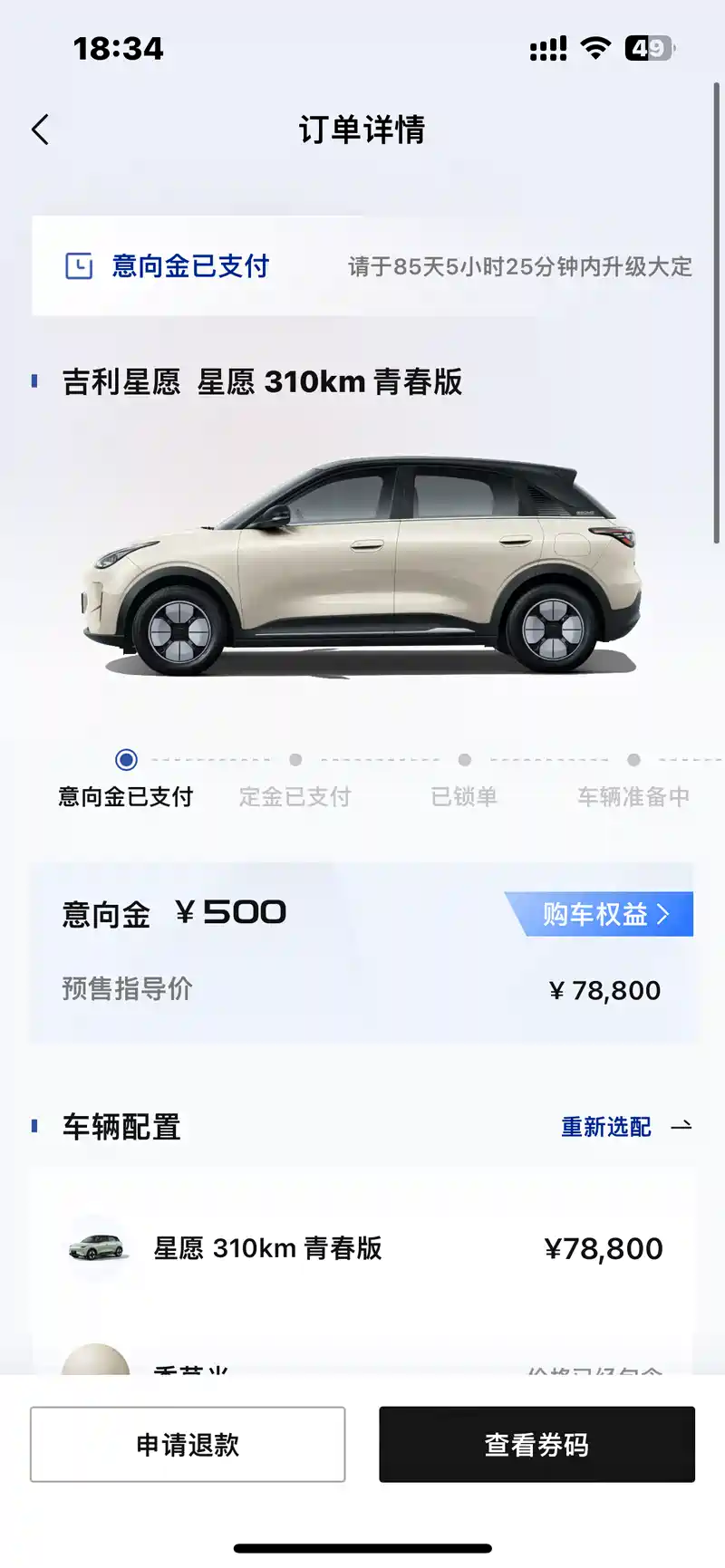在考虑到底要海鸥还是再看看其他品牌的时候,在汽车之家无意中看到了星愿的视频,然后就点进去了解一下,这一看就迷上了她~,我本身对汽车就略有研究,对于国产车,吉利的技术质量储备还是很有底蕴的,毕竟融合沃尔沃后,开发出来的领克就很有口碑。在安全和质量上还是信得过的。然后就各种研究星愿,可惜一直没有上市,只是公布了一个预售价。也不知道金昌有没试驾车,准备联系武威的经销商去试驾看看实车。十一的时候,广场做了一个车展促销,就带媳妇去看看转,毕竟是小地方,并没有多少车辆展出,转了一圈也没有注意到吉利,准备走的时候,突然看到比亚迪海鸥,想着来都来了,就再去看看,结果,被我瞄到一辆米色的星愿就停在10米卡外,赶紧拉媳妇过去看车,这没有对比就没有伤害啊,4S放了一台顶配的星愿,你这拿来和海鸥直接没法对比了,空间,内饰,造型···媳妇喜欢啊,哪里还有心思看海鸥。销售还在旁边和另一对年轻人介绍车子,我就自己用汽车之家看到的资料介绍给媳妇,比如前备箱,电动后尾门,最主要的独一无二的,独立悬架!虽然媳妇跟本听不懂···等销售忙完,我就立马凑上去,彼此介绍一下,我就认识了这个看起来和销售没有多大关系的史经理(开玩笑啊,史经理很敬业的)。他给我们介绍车子,我就说价格出来没有,我只关心价格,车子都摸透了,没等他介绍完就下定了500元小订单,升级1500元。史经理说正式公布后价格绝对下调,其实,最低配7.88已经超出我的预期,我在等正式发售,如果能降一万,就买,反正不着急这一个月的事。所以,我和媳妇的选车经历到此结束,等星愿上市,价格高了就回去海鸥,降下来就星愿了