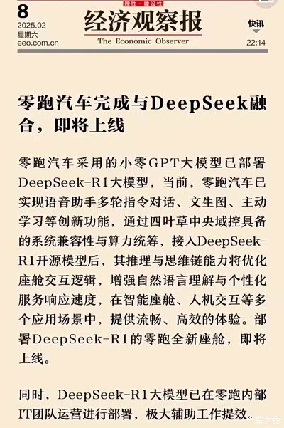 DeepSeek最近这段时间真的是太出圈了,我对智能AI这个领域还是比较好奇的,尤其是最近看到零跑汽车接入了Deepseek这则消息,其小零GPT大模型已成功部署DeepSeek-R1大模型,还是第一批中唯一的新势力车型,作为零跑车主的我真的想感叹零跑真的是慢慢的做大做强了。