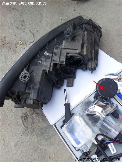 拆下来后,箭头的地方钻眼,如果没工具,用美工刀,慢慢的扩也行,注意尺寸,别太大,疝气灯本身带的防水胶圈,