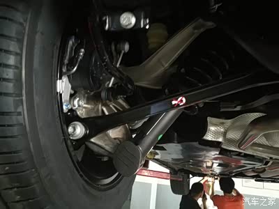 后五梁杆悬挂,上支臂,下支臂,车轮盘都是铝合金的,还带稳定杆,有点出忽意料,这张是在4s店给我装发动机护板时拍的,在地下负一楼。