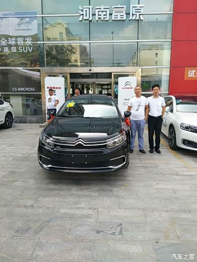 离开4s店,在4s店一个杞县员工带领下,先去加油站,加了300元95号汽油,走郑开大道,体验一下低速的感受,到开封又上高速体验一下高速的感受,你别说,这车造的还真的对得起我的这么多的银子,德系,美系,日系,韩系,我都开过,还真没体验过这开法系车高速,低速的感受,虽说是1、6T的动力,但却出忽我的意料,真是静若处子,动若脱兔,路感清淅,小的路面坑凹过滤的都可以,过减速带感觉强烈。低速60来了个急刹,车内都能闻到轮胎的焦胡味,刹车很稳。上了高速120,车内风噪很大,感到不太对,找了半天,原来是天窗没关住,关了天窗,立马清静,开一下音乐,设定巡航,尽情的享受,坐在小三c5上,聆听美妙音乐带来的无穷的乐趣,美!美!美!真美妙,值!值!值!真值得。拥有三代c5,是我千挑万选后,最正确的选择。下面是到家后在家门口用我的华为p9拍后照片,非专业,拍的不好忽喷。