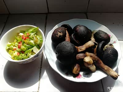 1,黑牛肝菌!配菜:在左边的小碗里有:青椒,红色的小米辣,蒜瓣。