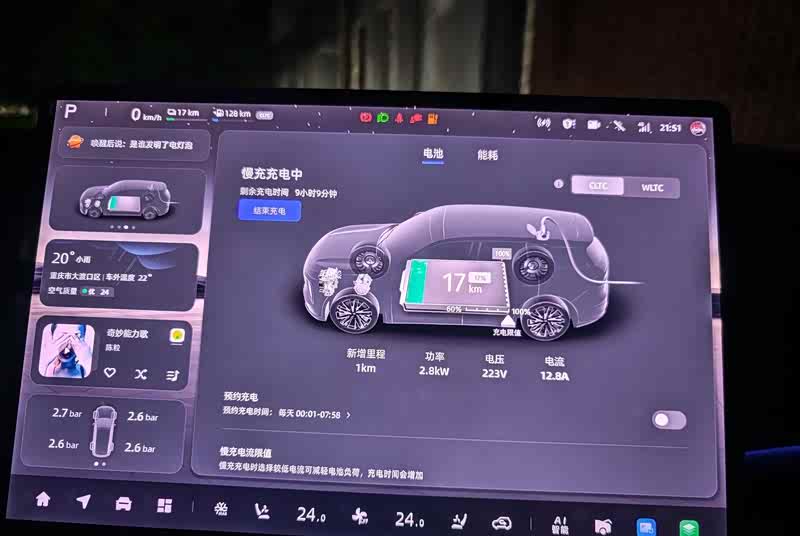 我平时用车驾驶模式都是使用Ai模式,会强制保电百分之二十,有家冲的情况下7,8个小时就可以充满,着重强调一下随车充的充电情况,从百分之二十到百分之百需要九到十个小时,只能平时应应急。