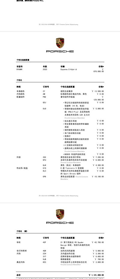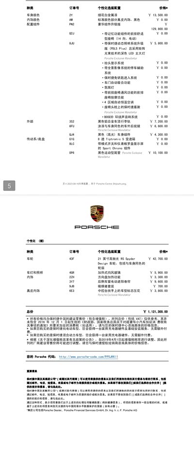 附上保时捷选配单,是真的贵,但这台选配的也真的很不错,除了没有烂大街的波尔多红座椅![]()