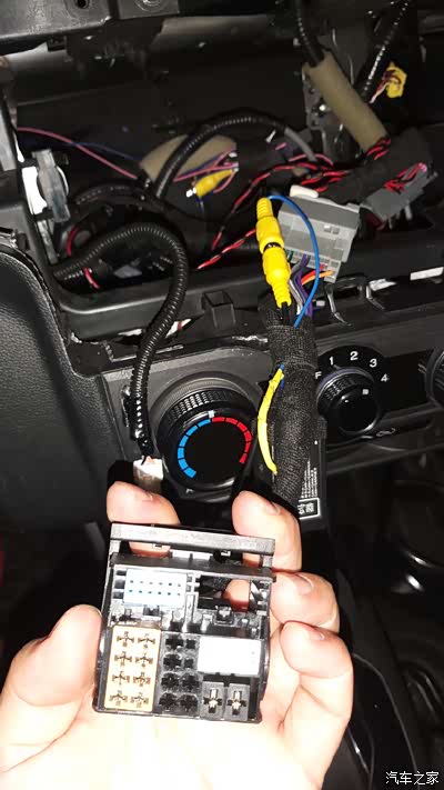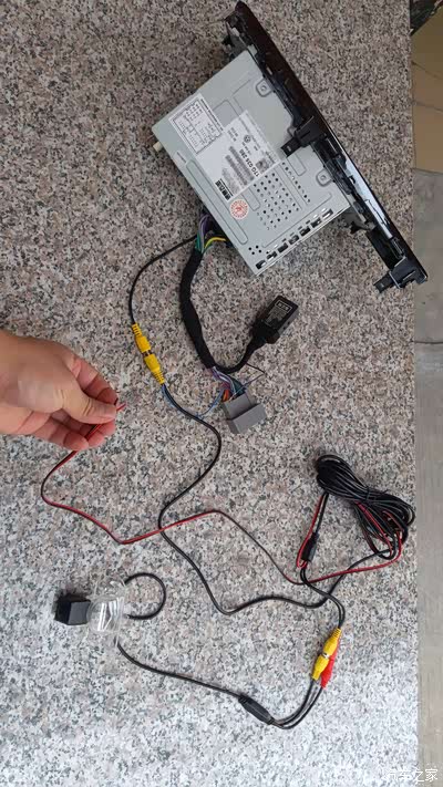 这里我给大家附上完整的接线案例图(打码保护卖家again),特别指出手上拿着的是位于车厢尾部的倒车检测线,正极接倒车灯12V,负极接地,不接地我试过出不来图像,这个跟MIB280的机器有关,因为我知道有些车的后摄检测线是不用负极搭铁的。