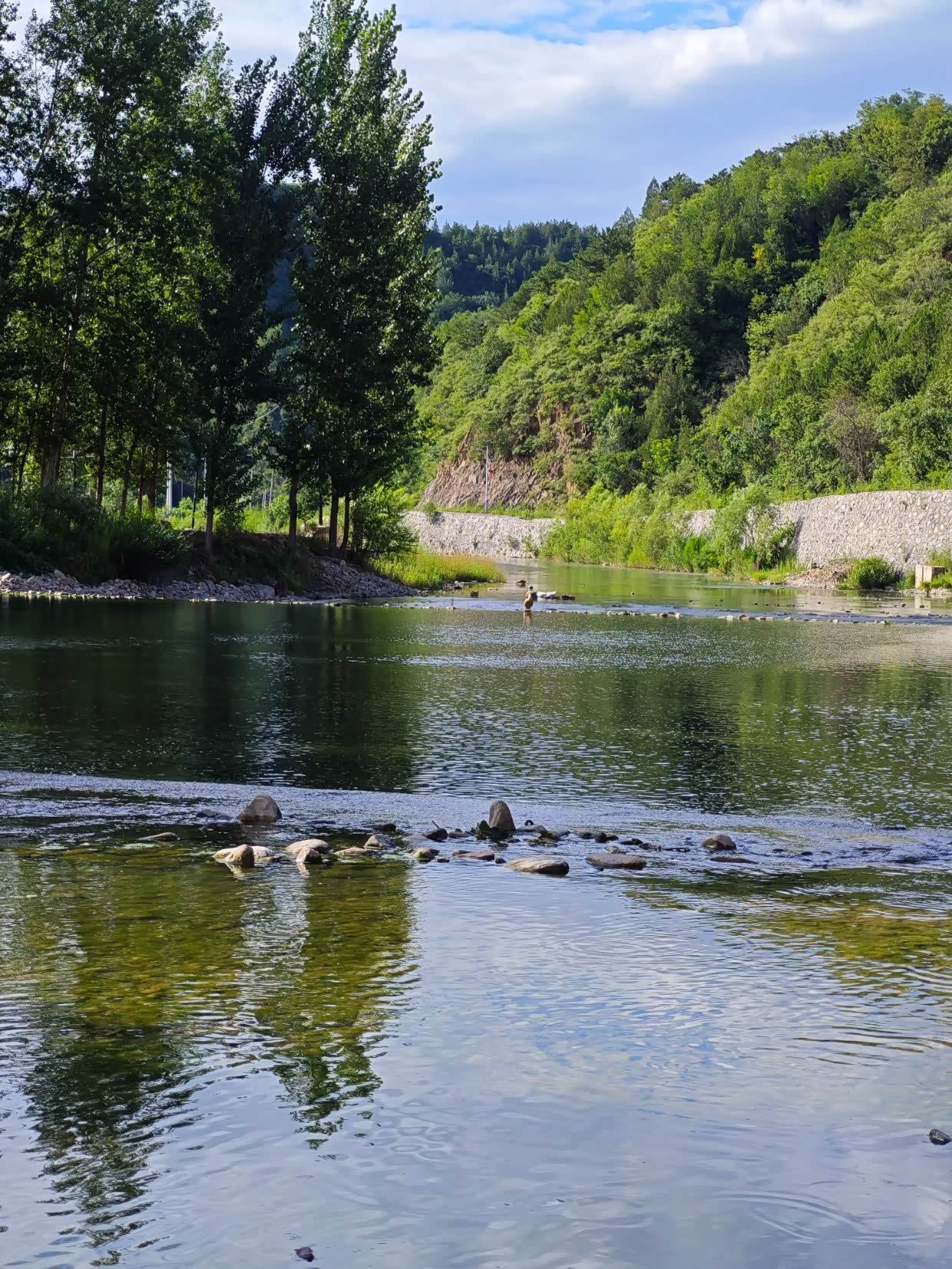 抵达清水河,眼前的景色美得让人窒息。河水清澈见底,在阳光的照耀下,波光粼粼,像一面巨大的镜子。远处的山峦连绵起伏,郁郁葱葱,与蓝天、白云、碧水构成了一幅绝美的山水画卷。河边有几棵大树,枝叶繁茂,投下一片片清凉的树荫。我把车停在树荫下,打开车门,清新的空气裹挟着河水的气息扑面而来,瞬间驱散了一路的疲惫。