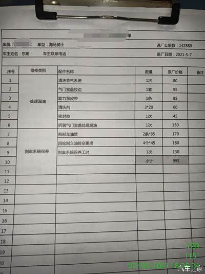 142890公里数,换助皮带,刹车油及前刹车左右油管……