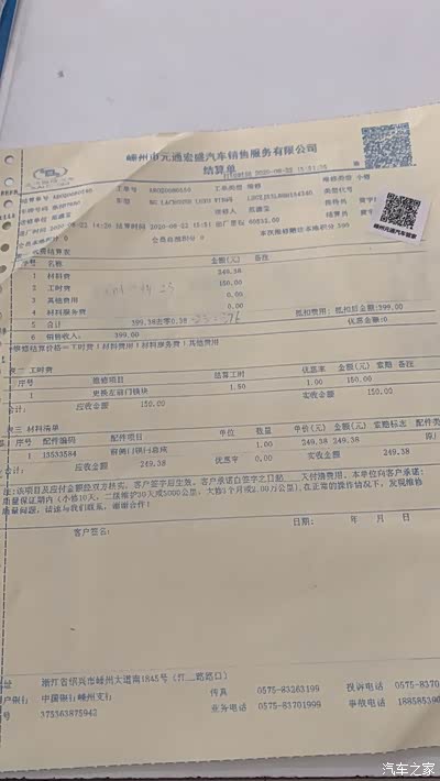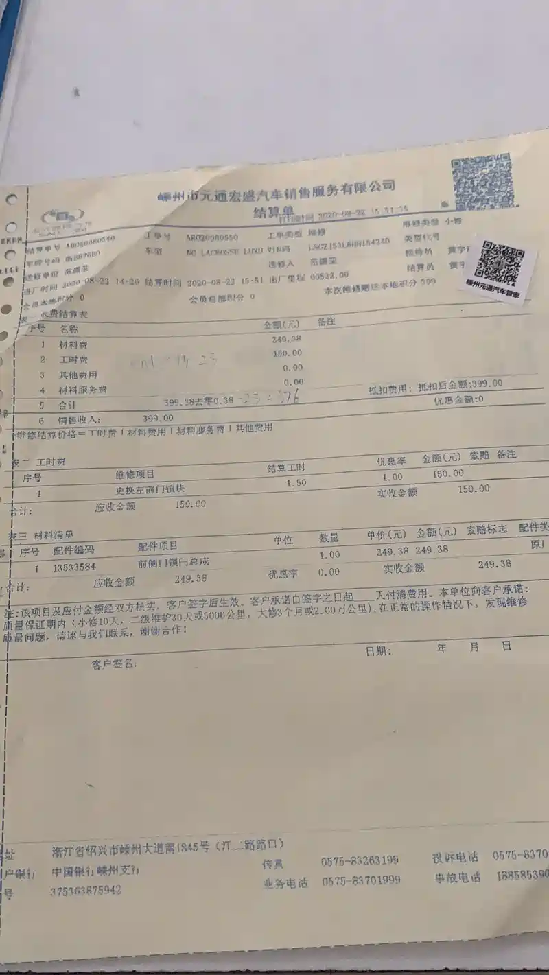第三个故事,上个月,8月20日,晚上下地库到车里拿东西,发现驾驶室锁块坏了,表现为完全不能锁门,遥控钥匙,门把手,门内按钮,全部失效。。其实差不多个把礼拜前,就出现过驾驶室通过遥控钥匙和门把手无法解锁的状况,只能进副驾驶,伸手去开驾驶室的门。因为之前已经不正常,所以那天晚上我就想去试试看门能不能解锁,结果就发现不能上锁了。8月22日回老家趁有空去当地4S修了,换了锁块,工时费给了85折,一共376块。