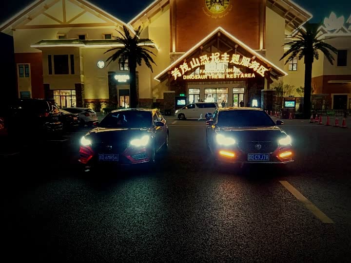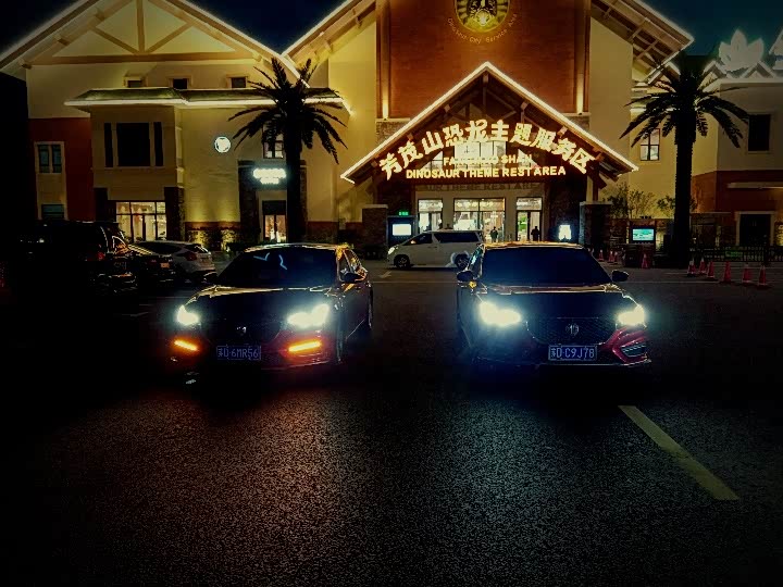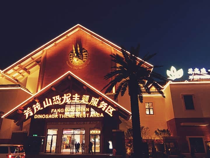 芳茂山恐龙主题服务区,晚上橘黄色的灯光渲染着欧式的建筑,是不是非常的漂亮哦,以后有路过的朋友,可以进来参观一下哦!