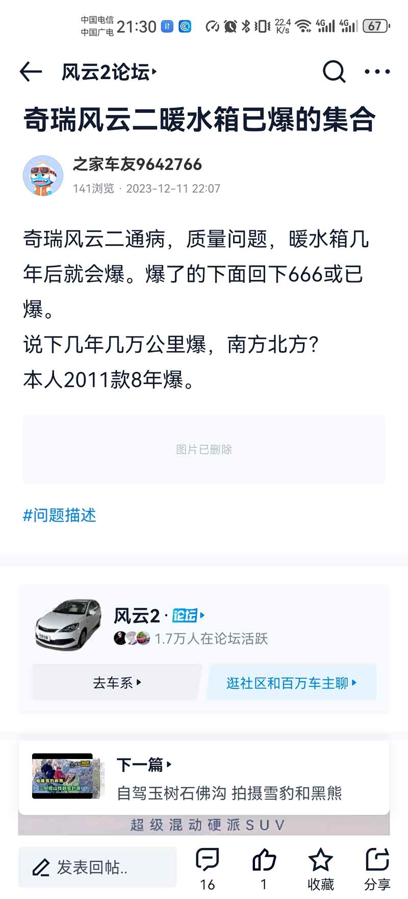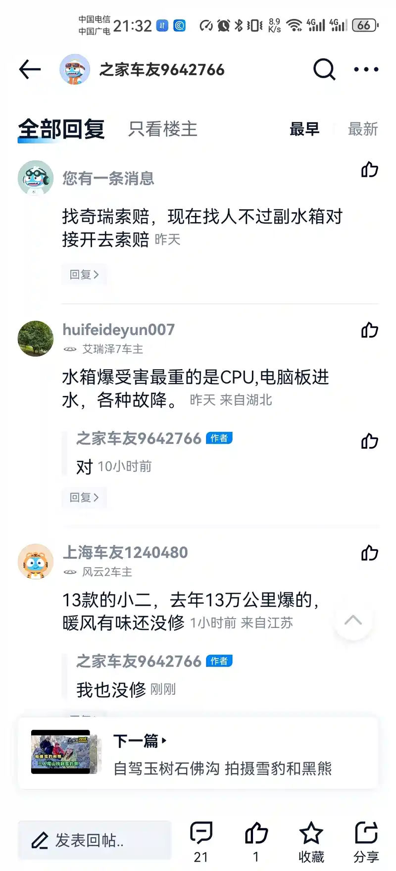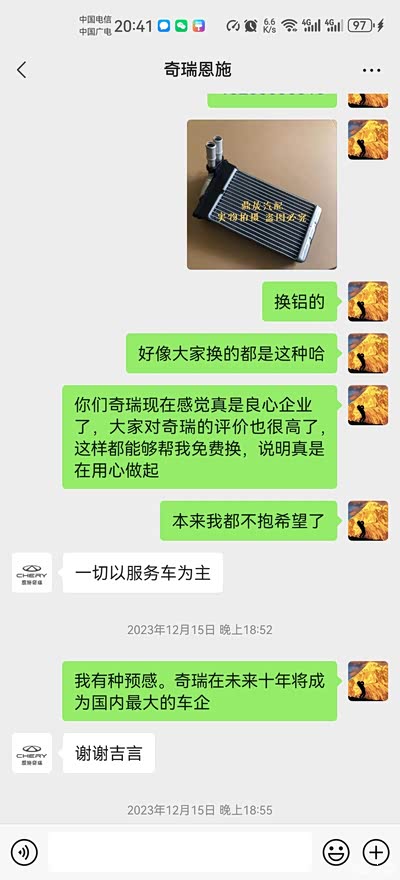 奇瑞良心企业,14年风云二免费换暖水箱