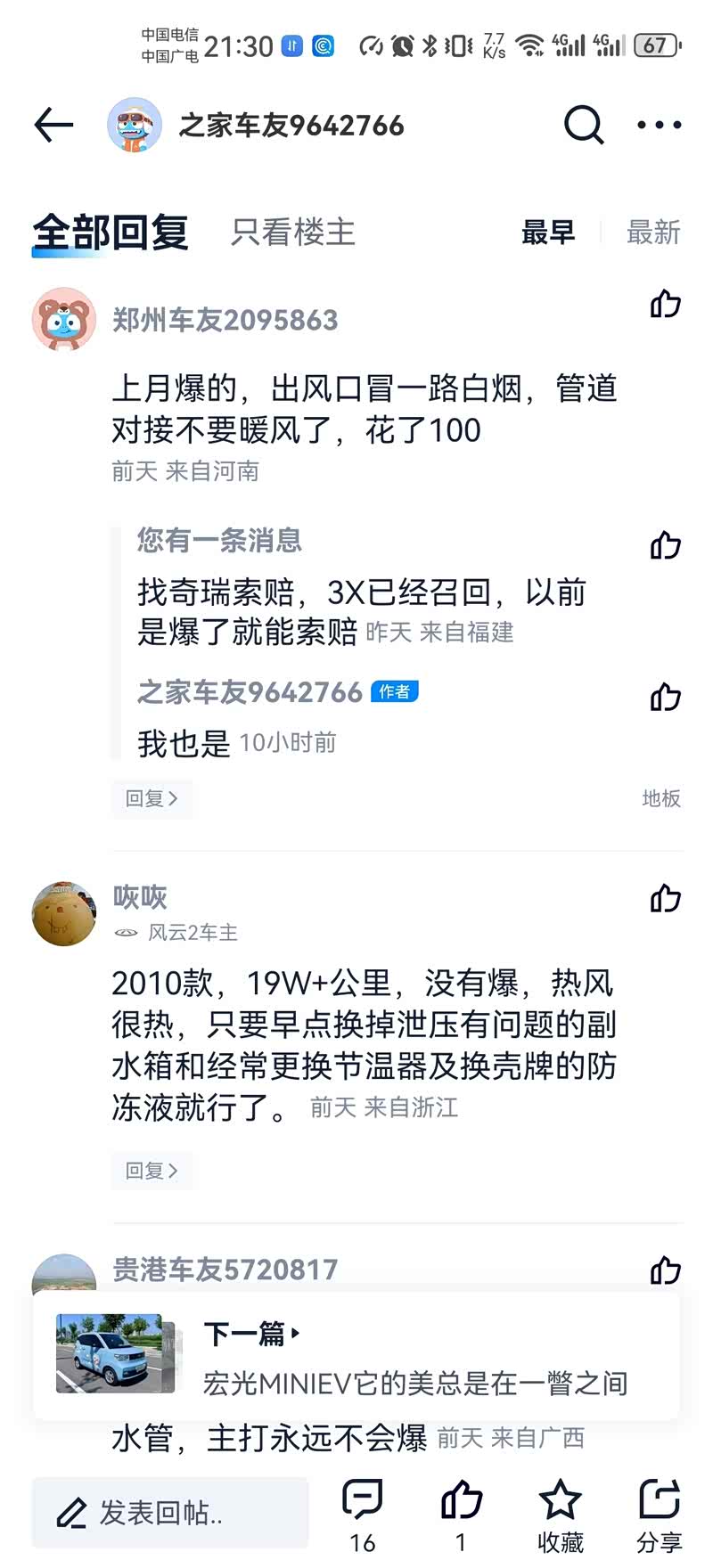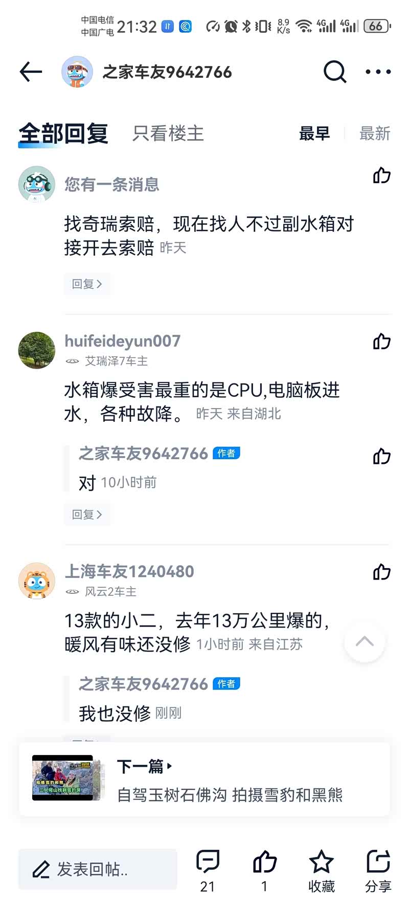 第5手车主投诉已爆暖水箱质量问题。