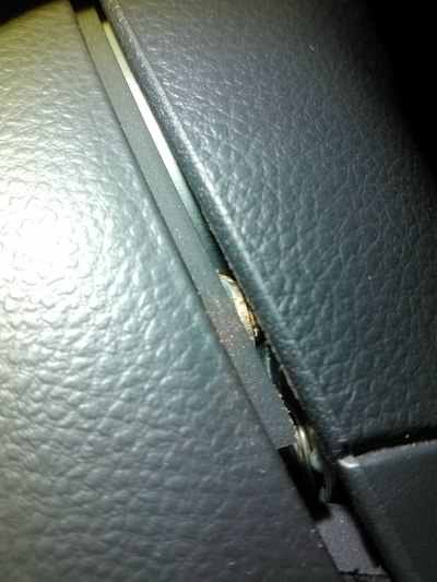 进到车库后熄火拔钥匙,用手电开始研究方向盘了。发现方向盘缝隙很大呀,可以看到里面的结构哦。仔细瞧了瞧惊喜出现了。触点!发现了触点!。。。。