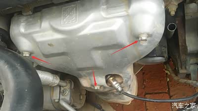 下面就要拆掉这个保护罩了,下面的哪颗螺丝旁边就是前氧传感器(自己新换的),如果不拔掉插头,这个盖子是没办法拿出来的,拧下这三颗螺丝,去掉发动机保护罩。