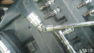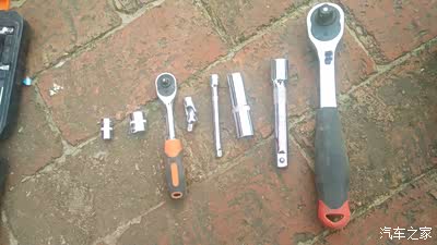 用到的工具从左至右依次是:1/4的8mm短套筒、14mm短套筒、1/4飞扳手、万向杆、加长连接杆、1/2的14mm长套筒、1/2连接杆、1/2飞扳手。