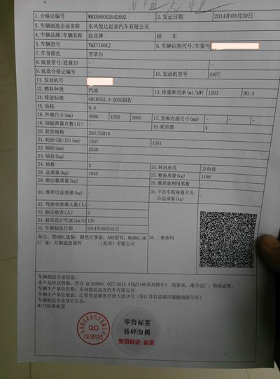其实14年12月27号交的定金,中间办贷款等了好长时间,1月20号才把所有手续弄齐。说下我的裸车价吧,77000手动标配,送贴膜+前后挡,挂烫机,遥控玩具车,7次保养,脚垫、坐垫,拖把,还有不值钱的小东西,大概就这么多,提车时里程10公里,用车感受,减震确实有点硬,过坑洼路面比面包强点,只要不是飚车党1.6完全够用,超车并线完全没问题,在车里几乎听不到发动机的声音,只不过胎噪有点大,下面是认证图片还有些装饰图片 大家将就着看看吧,文笔不好就说这么多吧 下面看图