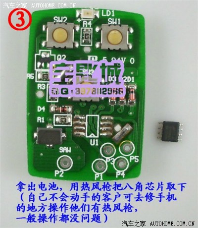 遥控钥匙的滚动编码原理在这不累述,大家可以到百度上搜一下,这里只讲我们小威的怎么改。网上有很多遥控钥匙是对码的,用原配钥匙和新钥匙进行射频交换,使新钥匙获取原车钥匙编码从而和车辆匹配,而我们的小威不行,它采用的是HCS300系列芯片,不能对码,得进行移植焊接才能使用,下面我就用图给大家讲解一下