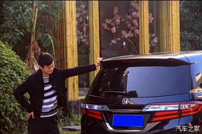 男模入镜了,我这哥们当过兵,身高、体型都属于比较健壮的,和奥德赛一比,他变得娇小了不少,奥德赛造型还是非常有“男人味”的。虽然朋友认为黑色的车漆比较深,有点太大众色了,但阳光下映出淡淡的蓝色,还是蛮有质感的。