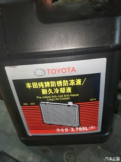 安装好水箱后添加丰田纯牌防冻液需要两桶,防冻液的冰点-35度,沸点106度。